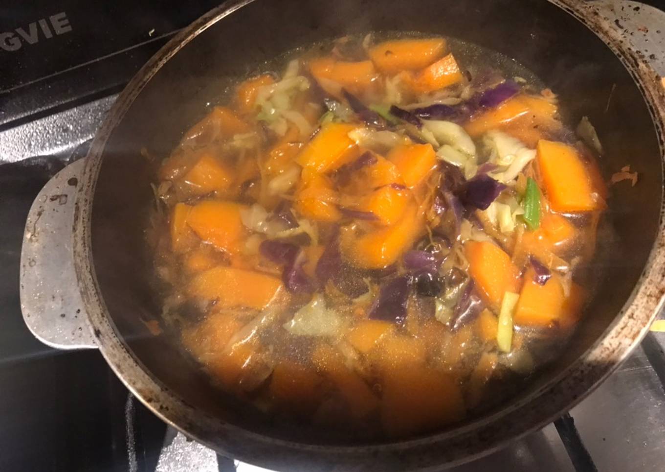 - Mezclar todas las verduras con el aceite. Una vez que está bien mojada por el acierte. Llevar a una sartén/olla y saltear queremos que la calabaza quede crocante pero cruda por dentro. Dejar cocinar 5 minutos. Y poner el líquido. O hasta que el líquido tome las verduras. Cocinar hasta que las mismas estén cocidas. Es normal que si usas repollo rojo el agua tenga color tipo negro