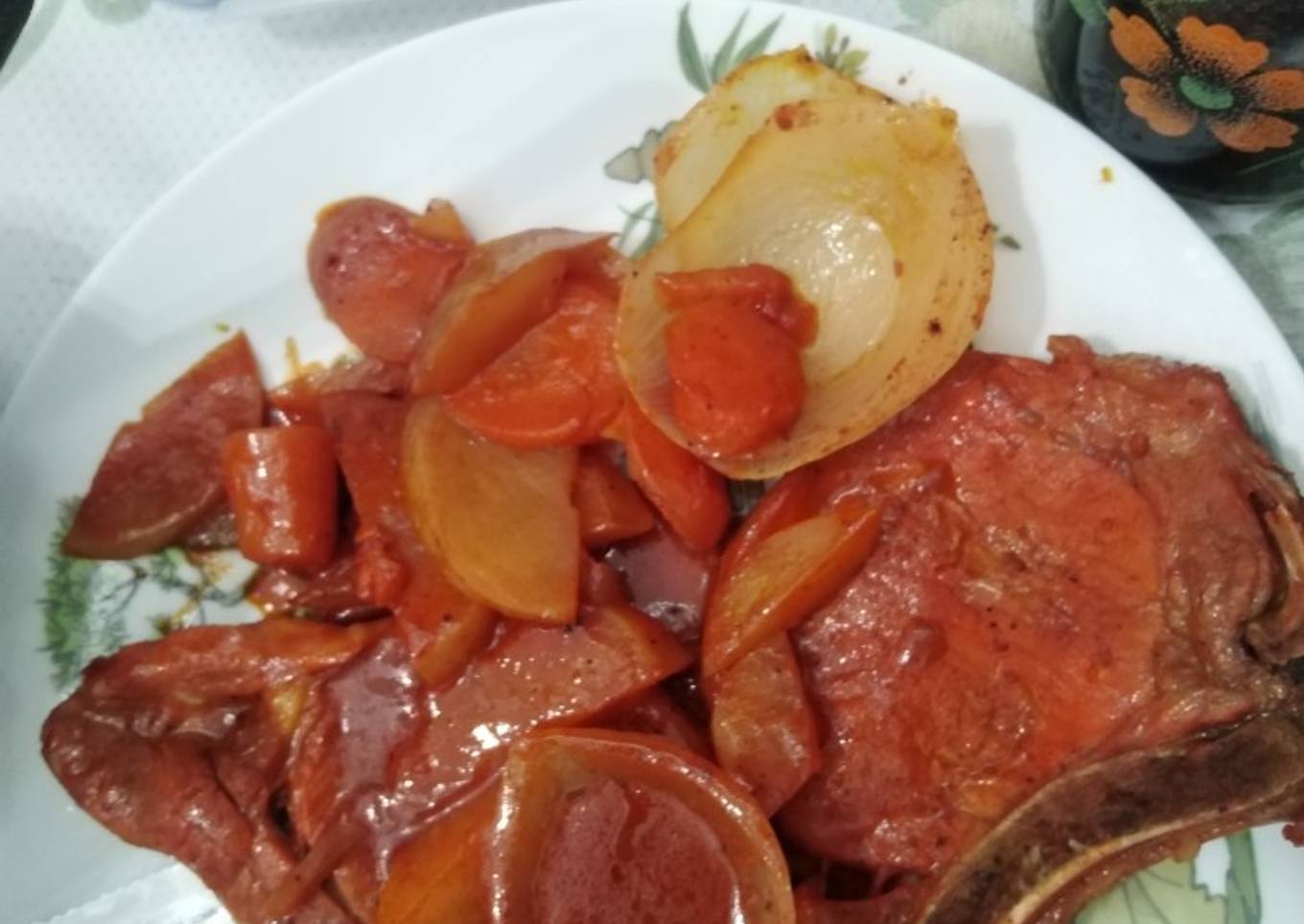 - Poner a calentar el aceite por 3 minutos, cuando haya pasado ese tiempo, agregar la cebolla y el ajo picadito y poner a cocer las papas junto con las zanahorias, en cuanto estén doradas agregar las calabazas, el tomate y el chile güero. Posteriormente agregar las chuletas con el marinado, cocinar por 20 minutos y agregar la cerveza. Cocinar a fuego bajo hasta que la carne y los vegetales estén perfectamente cocidos. CHEF GERRY. 👨🏻🍳