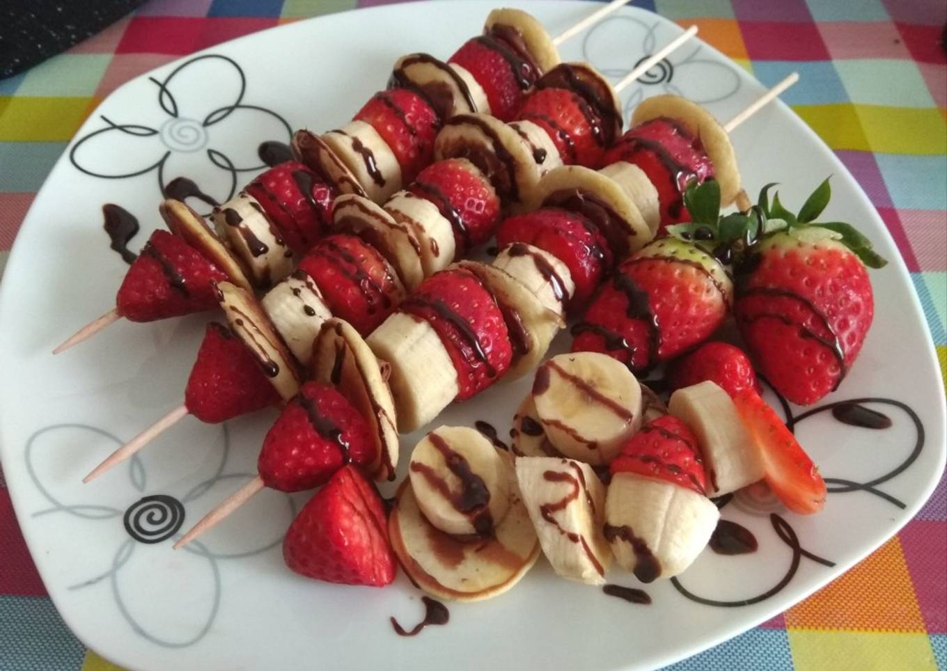 - Montamos las brochetas. Para esto, untamos un poco de crema de cacao en una mini-tortita la insertamos en el palo, un trozo de fresa, plátano y tortita con crema otra vez así hasta completar el palito.