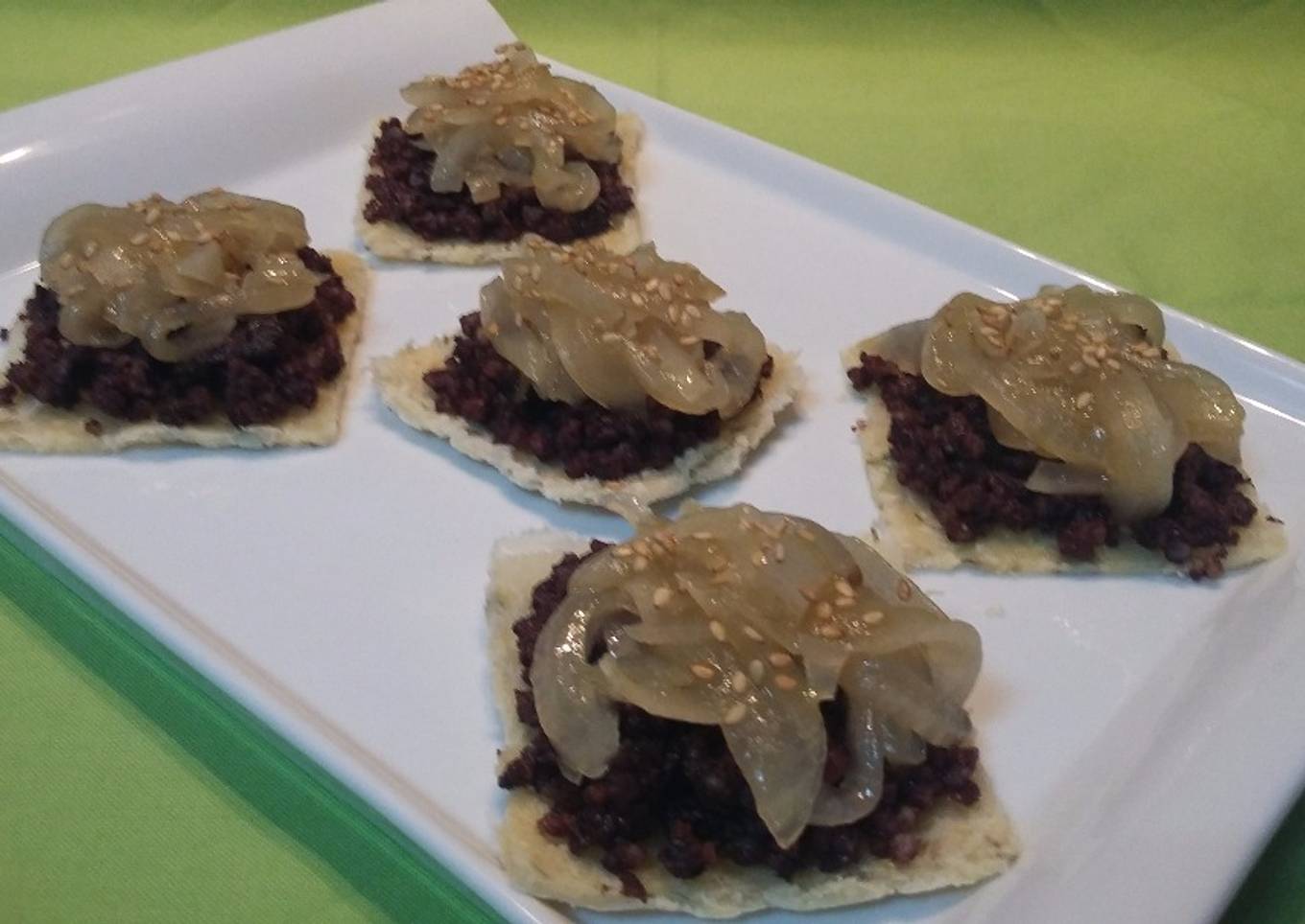 Tortitas de idiazabal con morcilla y cebolla caramelizada